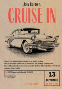First Baptist Church will host a Cruise In Car Show to kick off their new Men’s Ministry. There will be music, food trucks, and of course antique cars! Call for more information, or to ask about entering your special car. All is free except food from the food trucks will be at your own expense. Bring your friends and family!