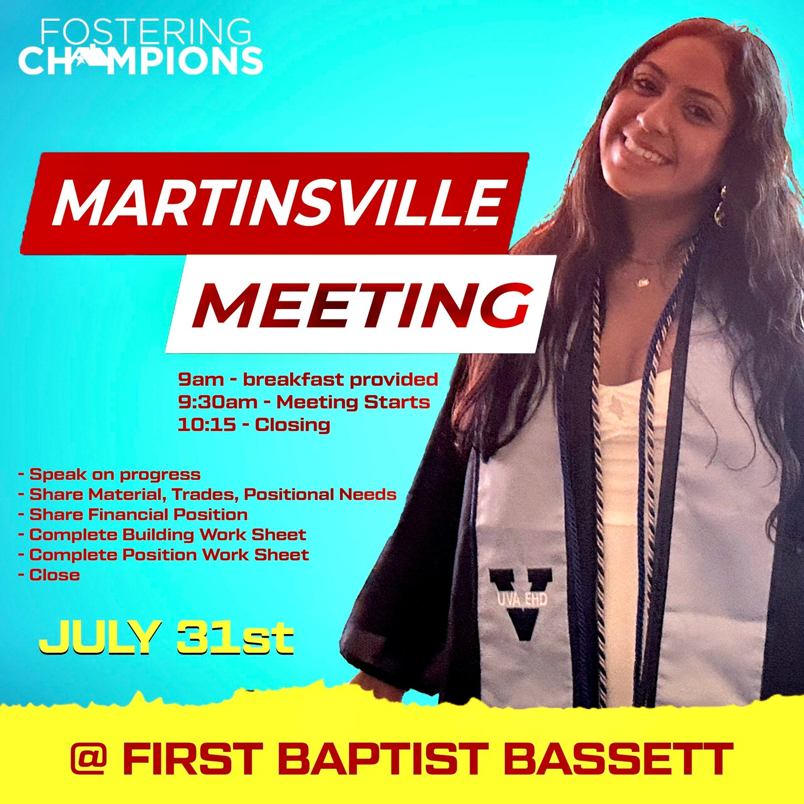 This is a breakfast meeting hosted by First Baptist Church of Bassett, VA. Founder of Fostering Champions will give a progress report and ask participants to consider the ongoing needs for teens aging out of the foster care system.
